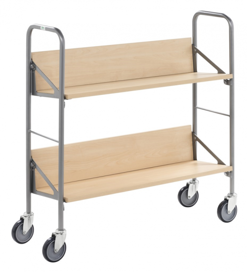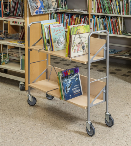 En pärmvagn med 2 sneda hyllplan i björkmelamin. Pulverlackerad grå ram. Pärmvagnen är lätt att manövrera och kan enkelt rullas fram och tillbaka efter behov. Levereras med 4 bokstöd.