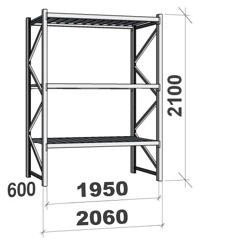 The kit includes2 side frames2100x600 and 3 shelf levels1950x600 with heavy duty steel beams, modular galvanised steel panel sections & safety locking pins.